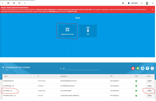 3.1) Para acessar: Rede → Equipamentos de Conexão → pesquisar cidade (siglas ok: PJA, CLS etc.) → OLT Huawei → Ações → Ver clientes conectados → Pendentes Camada 2. Atualize só depois do MAC.