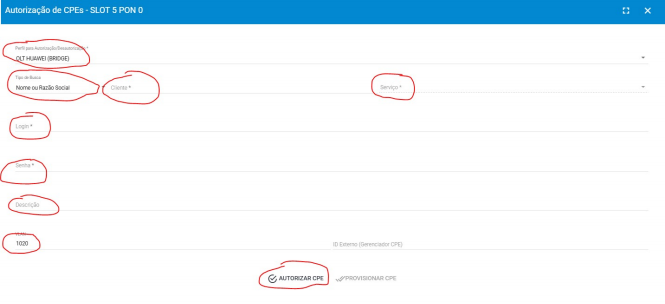 4.6 VLAN: se houver, enviar junto do PPPoE • 4.7 Autorizar CPE e aguardar sucesso, depois enviar ao técnico