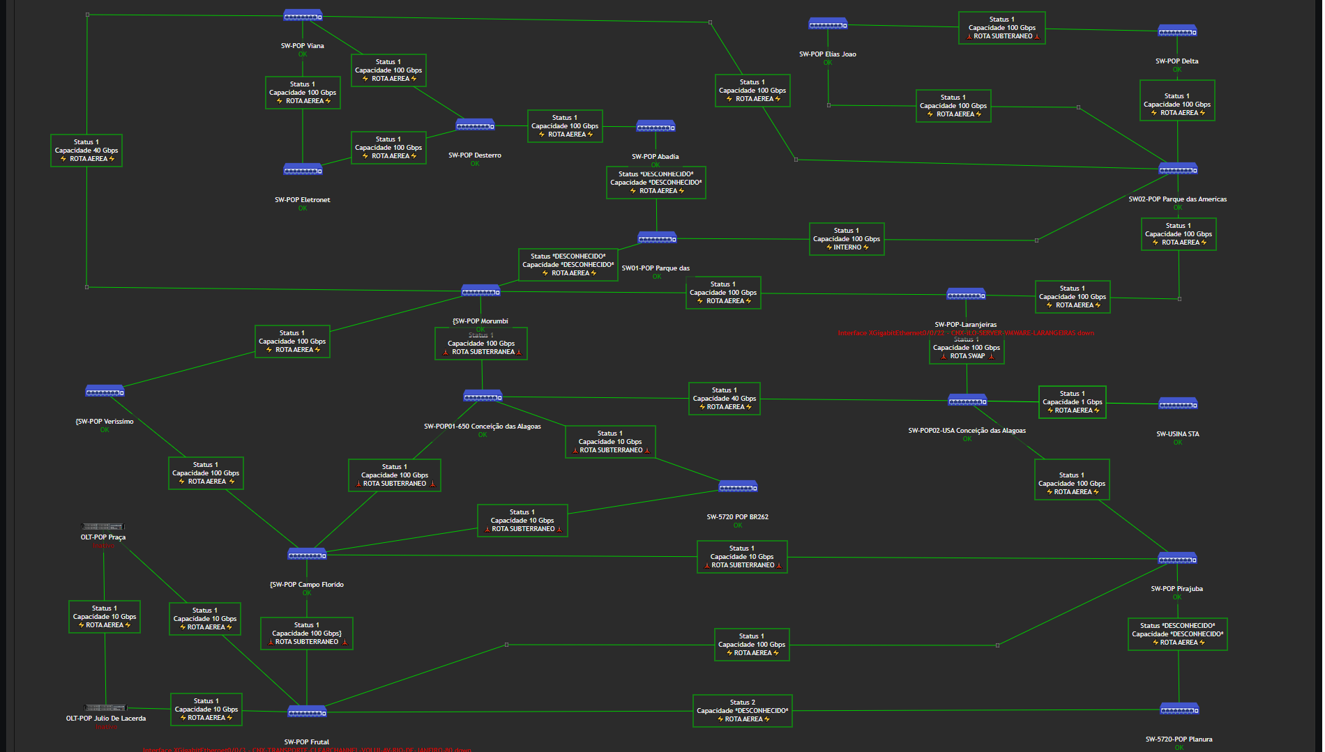 VEJA ABAIXO ALGUNS EXEMPLOS E TIPOS DE ALARMES DE ALGUNS HOST DA NOSSA REDE BACKBONE. MAPA DA NOSSA REDE BACKBONE