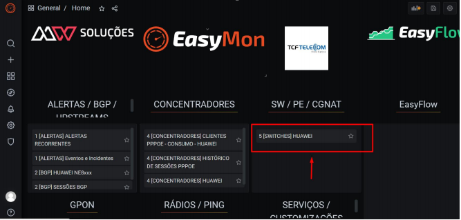 TODOS NOSSOS HOST SWITCH QUE FAZEM AS INTERLIGAÇÕES ENTRE AS CIDADES ESTÃO NO NOSSO MONITORAMENTO ZABBIX E GRAFANA. PASSO A PASSO PARA ACESSAR OS SWITCH. ACESSE NOSSO GRAFANA. NA ABA [SWITCHES] SELECIONE A OPÇÃO.